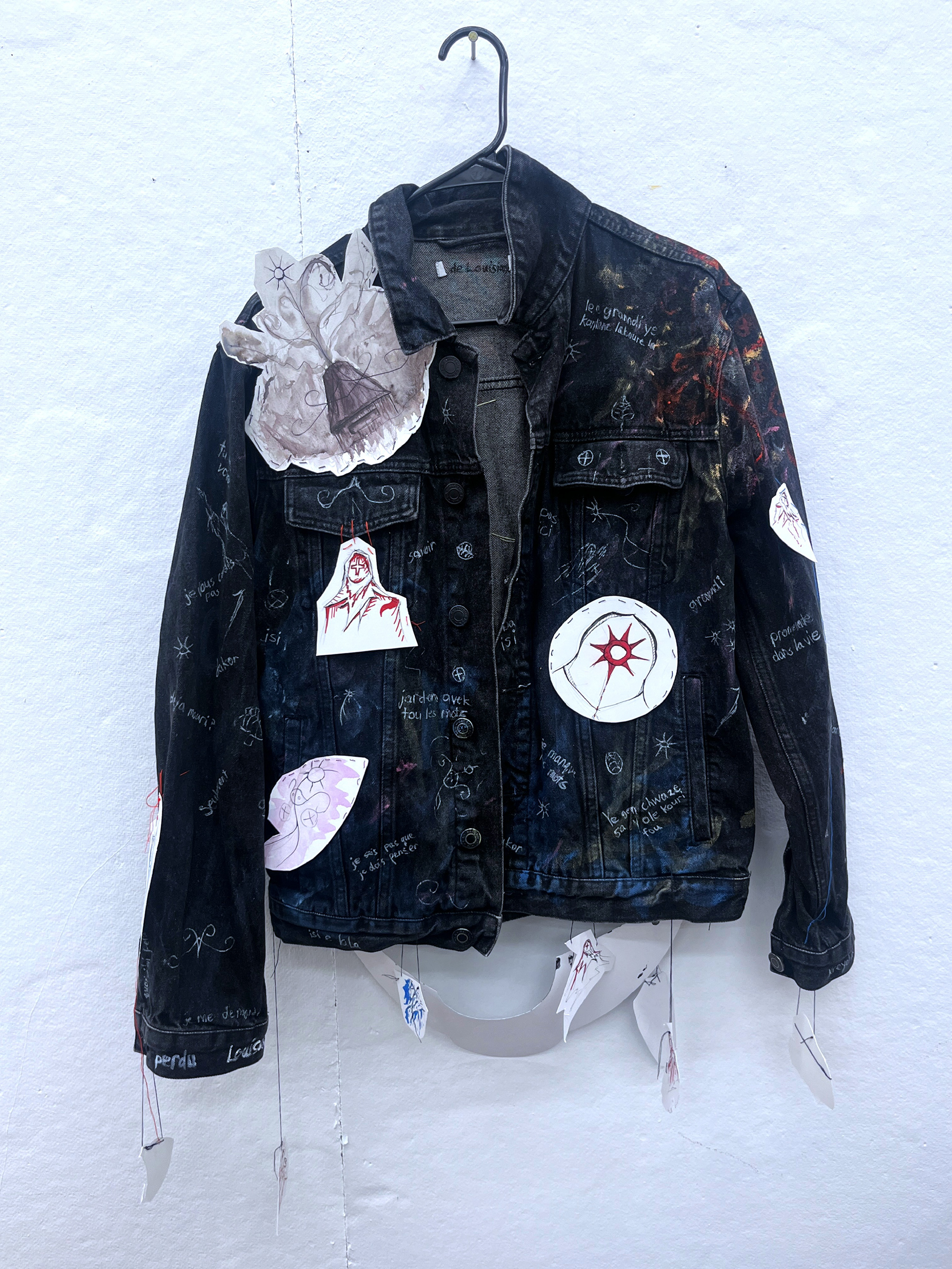 Louisiana Creole, the native language of my grandparents, was not passed down to me. The jacket seen in this gallery is covered in words fromĀ a mix of Parisian French and Louisiana Creole, along with creatures inspired by the veve of the voodoo spirit Papa Legba, master of communication. These elements work together to explore the sense of longing that comes with losing a language that is a part of your family history, along with the world it represents.