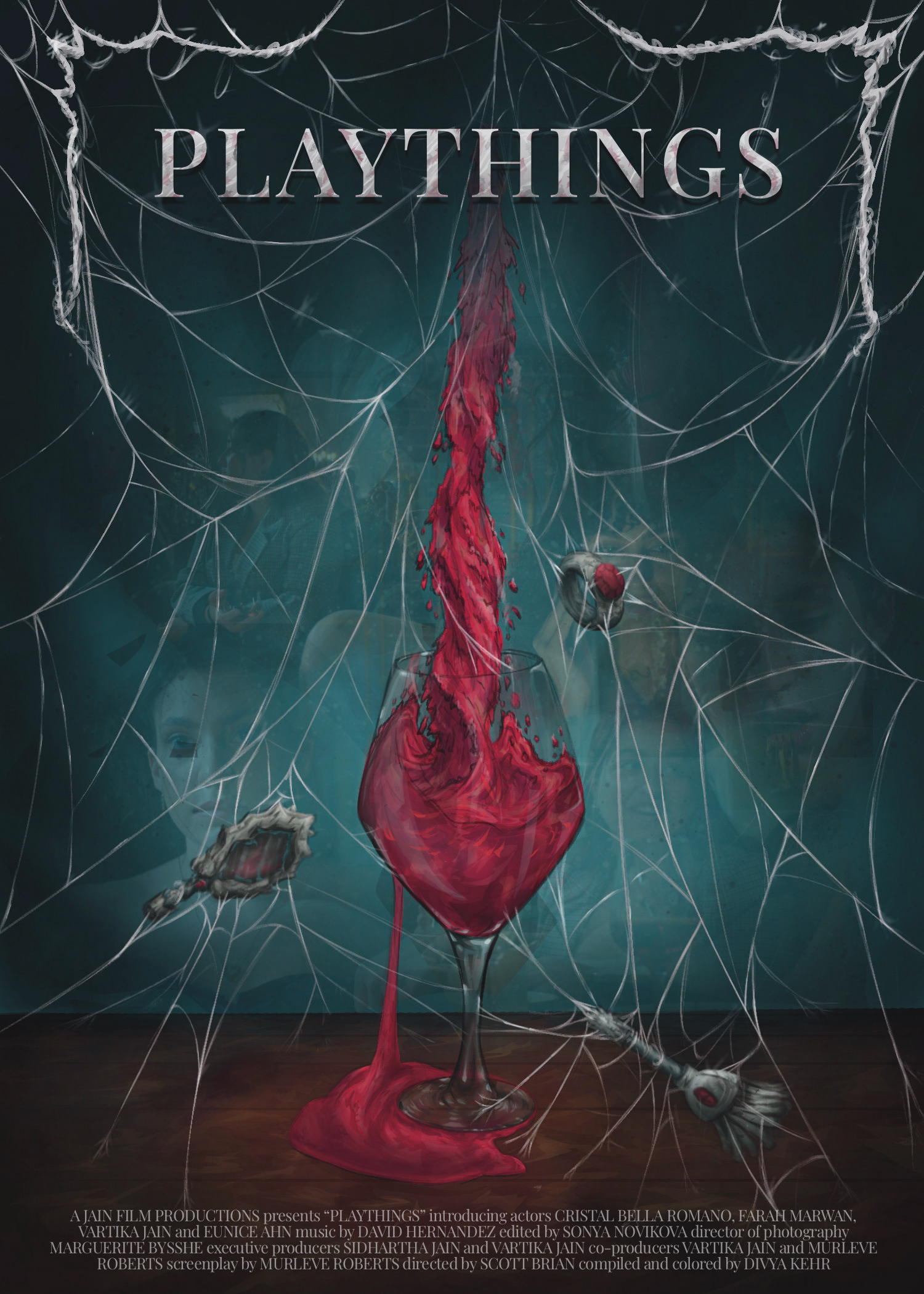 I was commissioned to make a poster for the short film "Playthings," a film where a group of friends reconnect at the house of the wealthy antagonist with whom they had had a turbulent relationship. Through the course of their dinner, the antagonist offers them drugged wine and makes subtle remarks to target the group's insecurities and break them down.