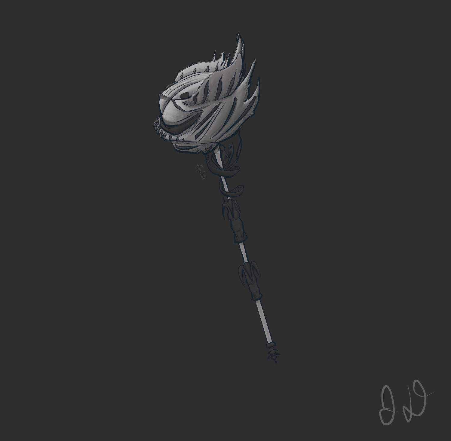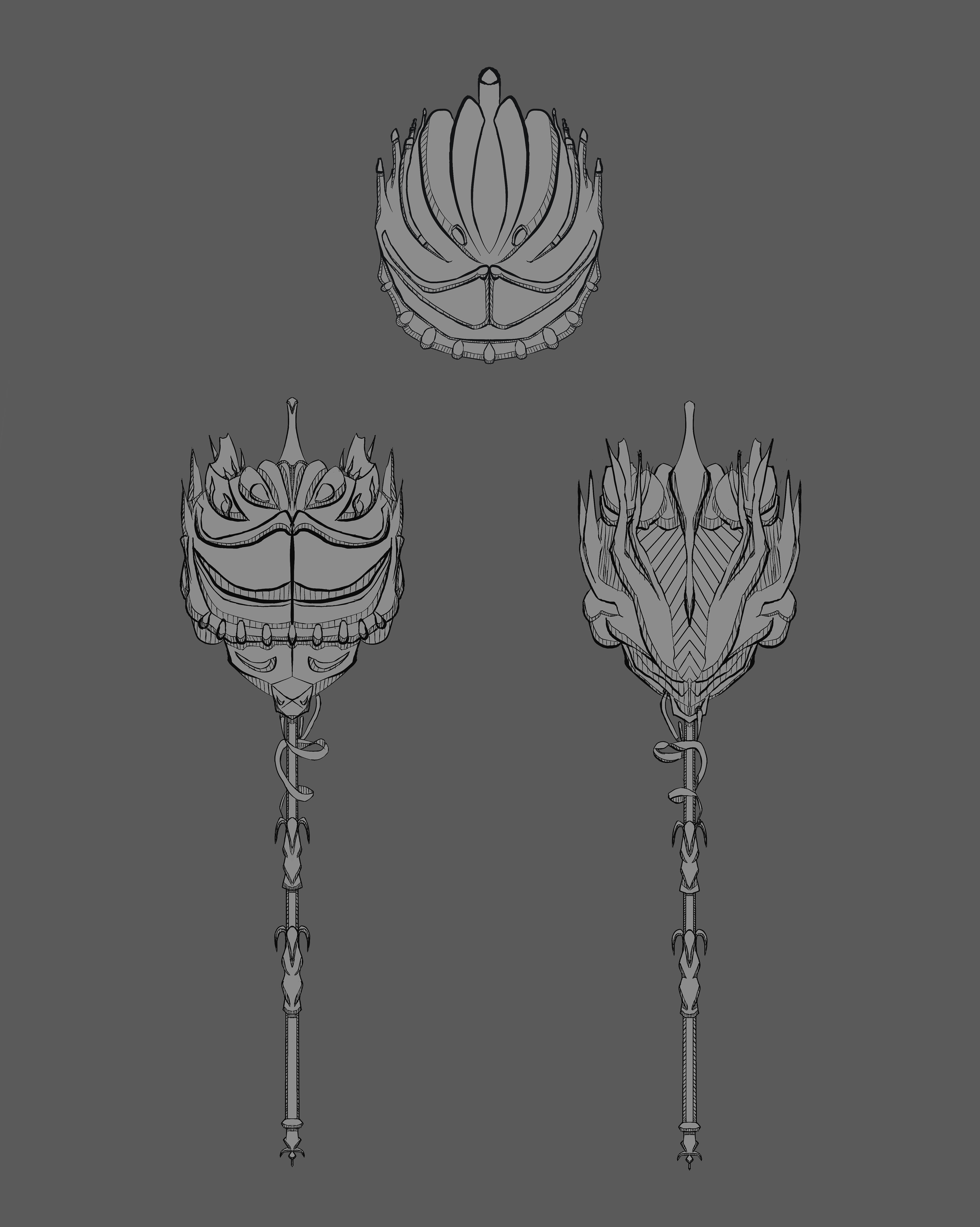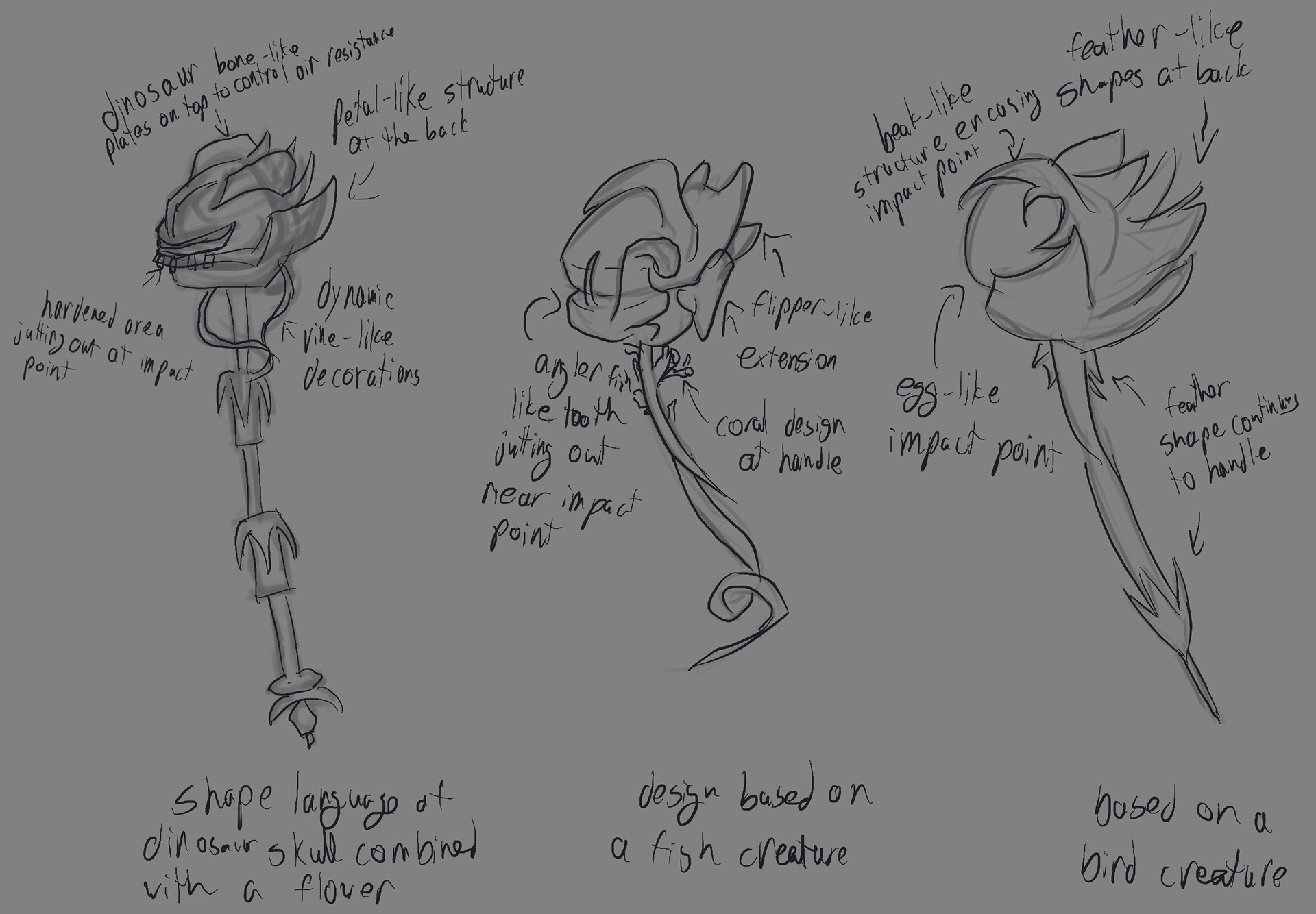 An original design for a hammer to be used as a weapon. The design was based on dinosaur skulls in combination with shape language from flowers.