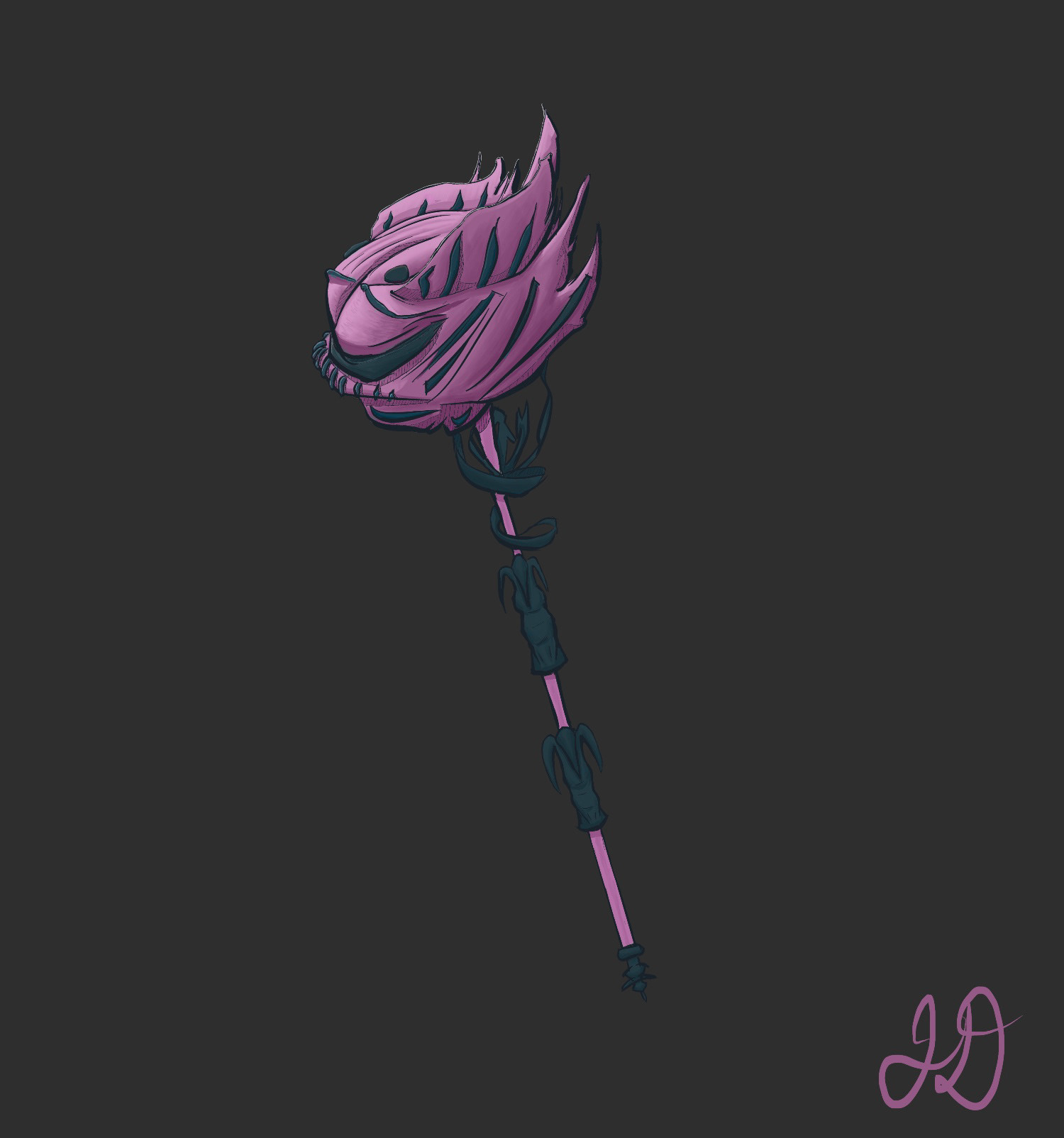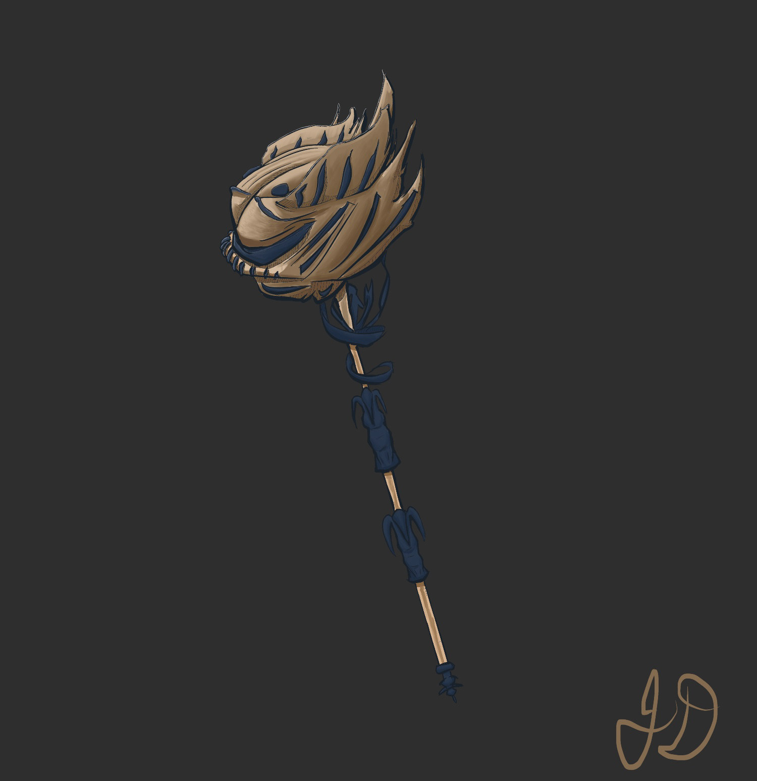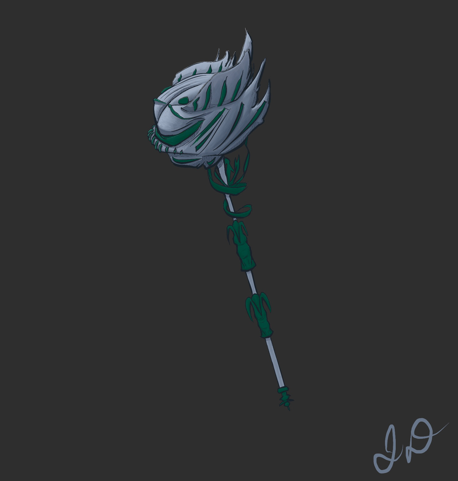 An original design for a hammer to be used as a weapon. The design was based on dinosaur skulls in combination with shape language from flowers.