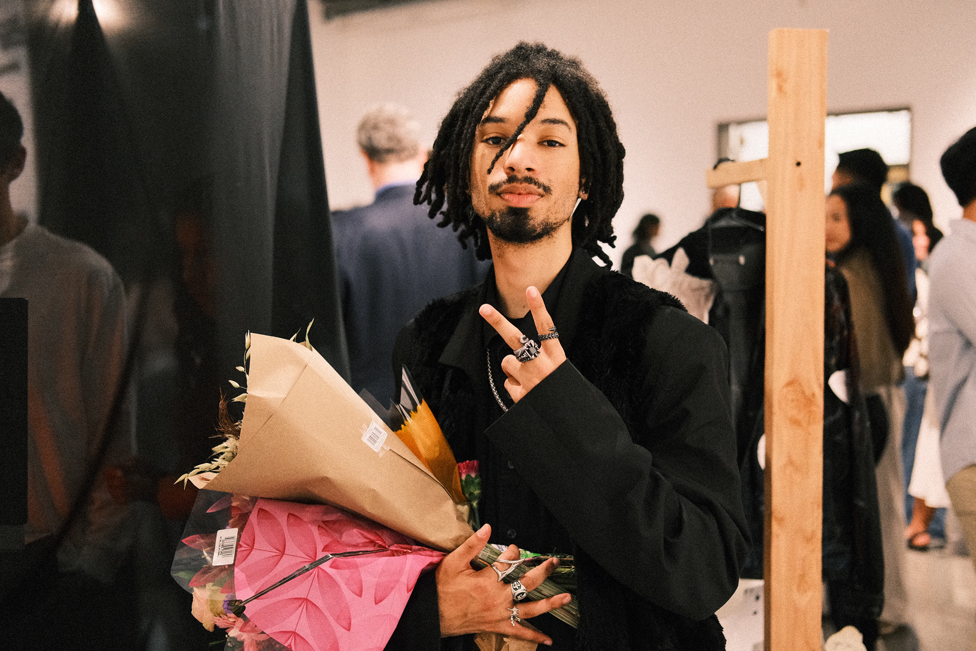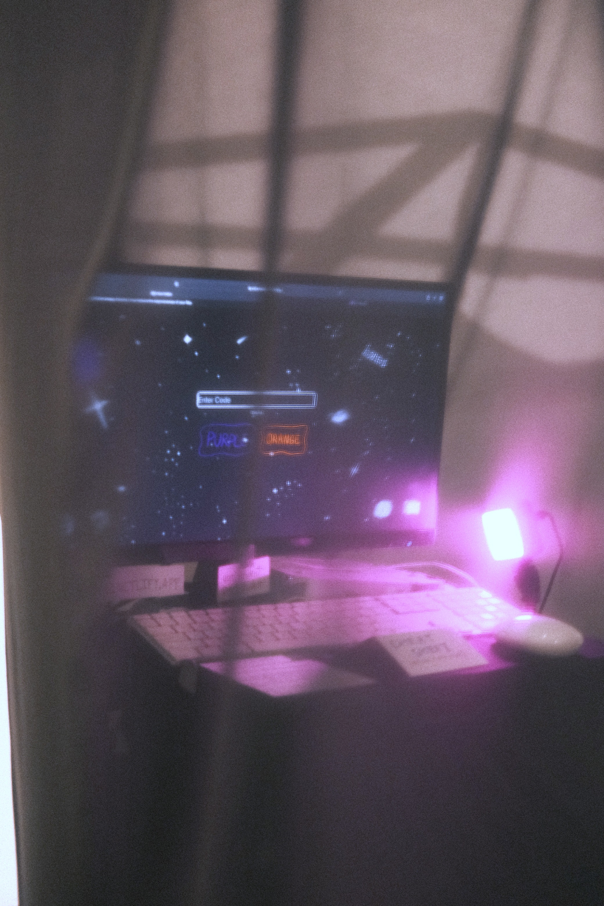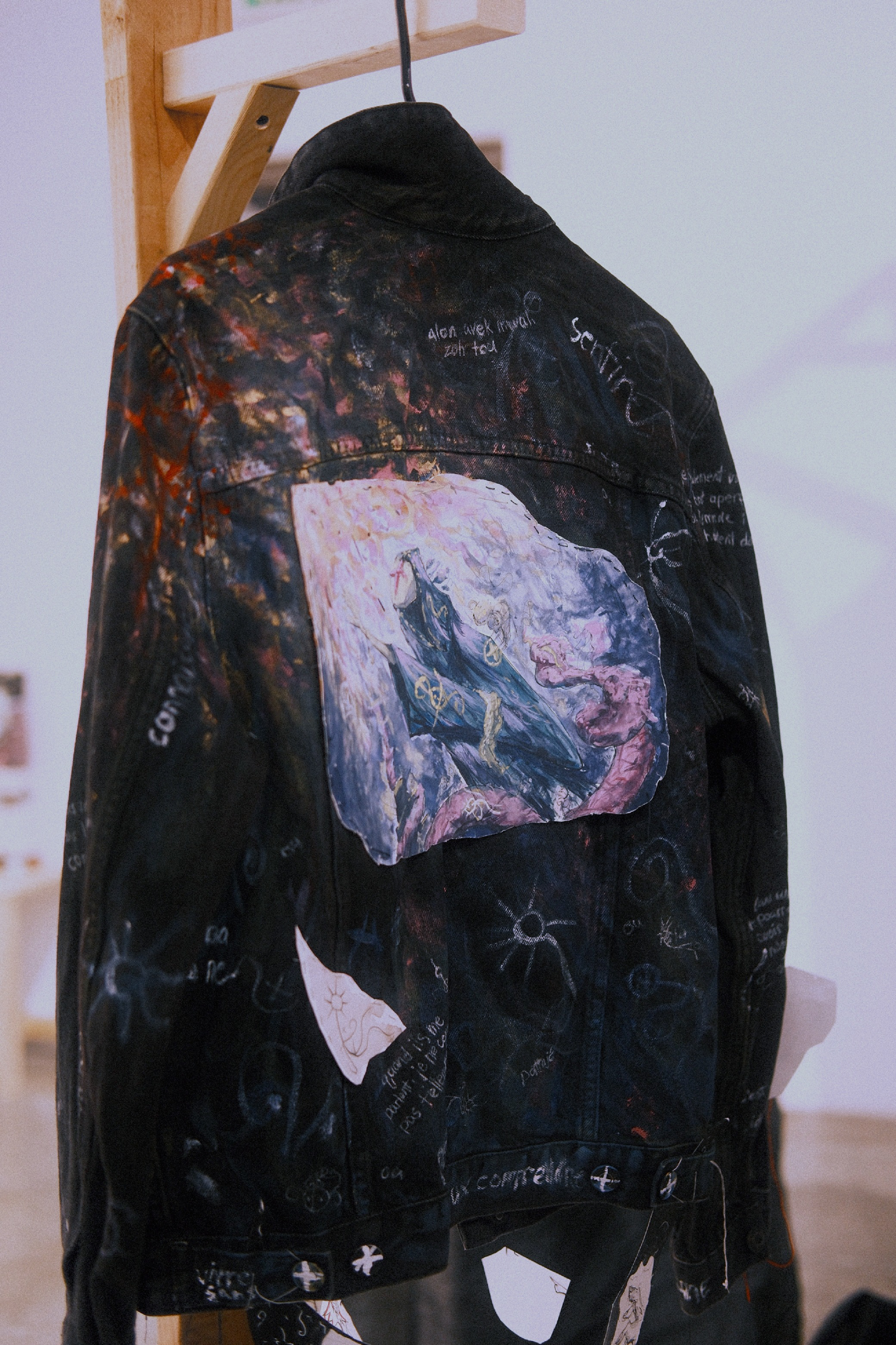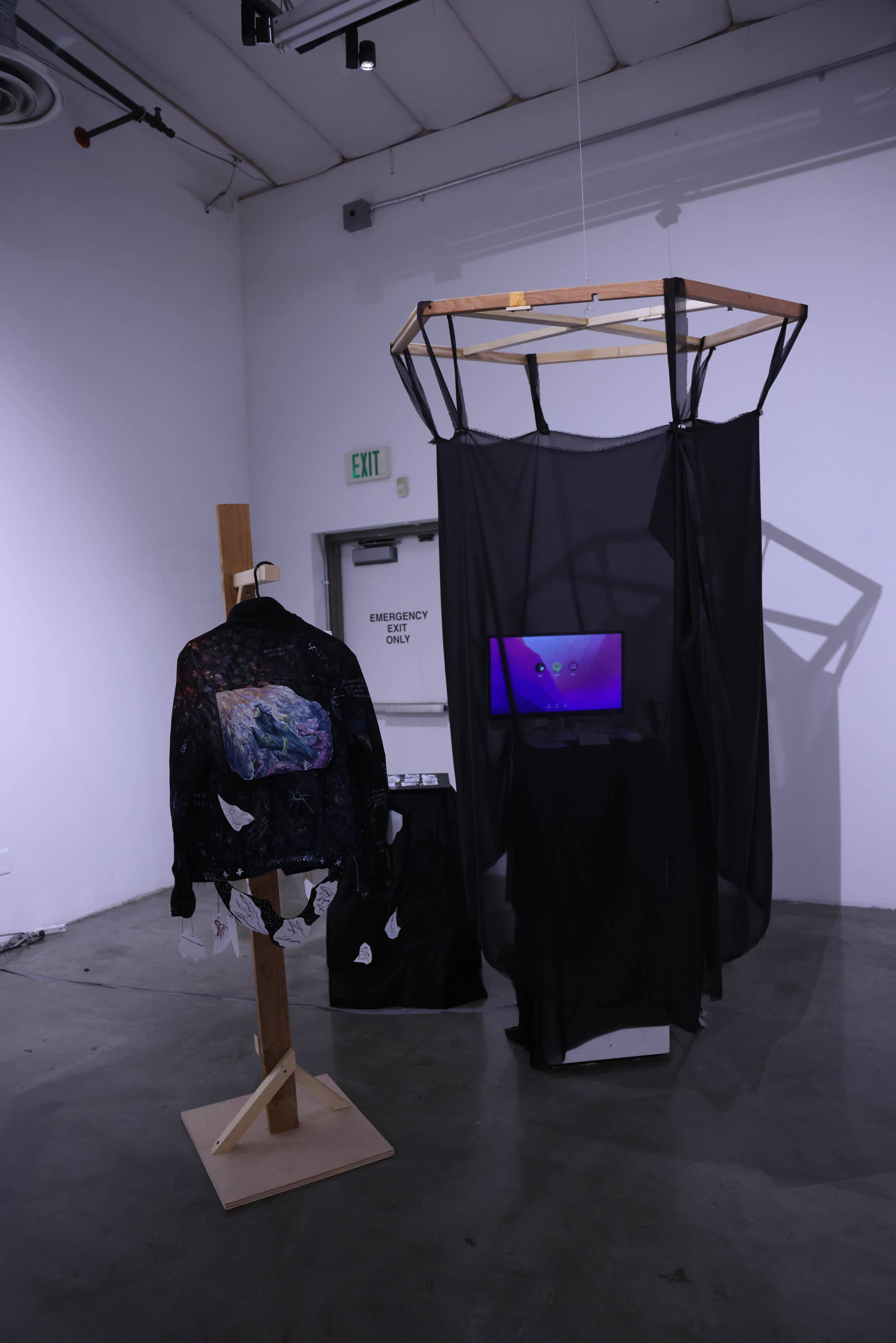 The above pieces are from my work with the USC Roski '25 BFA Senior Thesis cohort for our thesis show, titled "always to be found." I presented 3 pieces in the show, which I collectively titled "spirits yearning for understanding" due to their connected themes of communication, miscommunication, and language. For the install, the curators, Xyla and Georgia, suggested I have my pieces next to each other in a corner of the space, allowing the world building of the pieces to intertwine with each other. I built a wooden stand to hang the jacket from along with a structure to hang from the ceiling to drape a curtain around the installation of "color-coded." This installation created an intimacy for the experience that solidified the "alternate world" of the website.