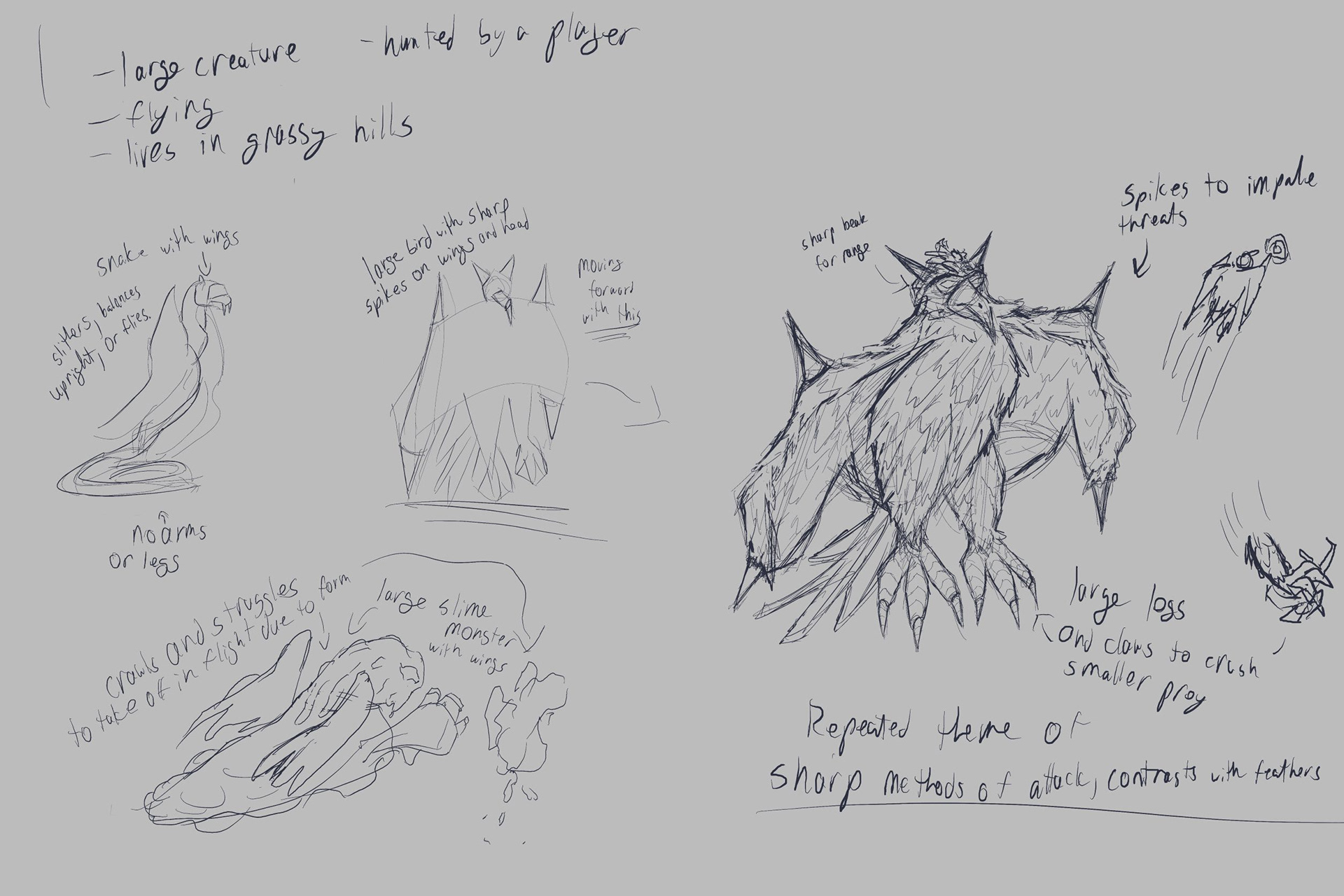Sketches in the ideation phase of this design. The left side shows the requirements for the creature and 3 different design ideas. The right side shows a sketched out version of the design I decided to go ahead with along with some notes.